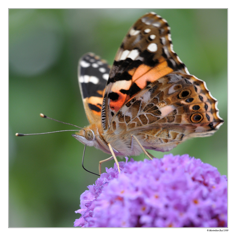 Dem Distelfalter schmeckt der süße Nektar, den der Sommer- oder Schmetterlingsflieder produziert. Der Strauch ist im Sommer über und über voller Schmetterlinge: Admiral, Kleiner Fuchs, Tagpfauenauge, Distelfalter, Weißlinge...