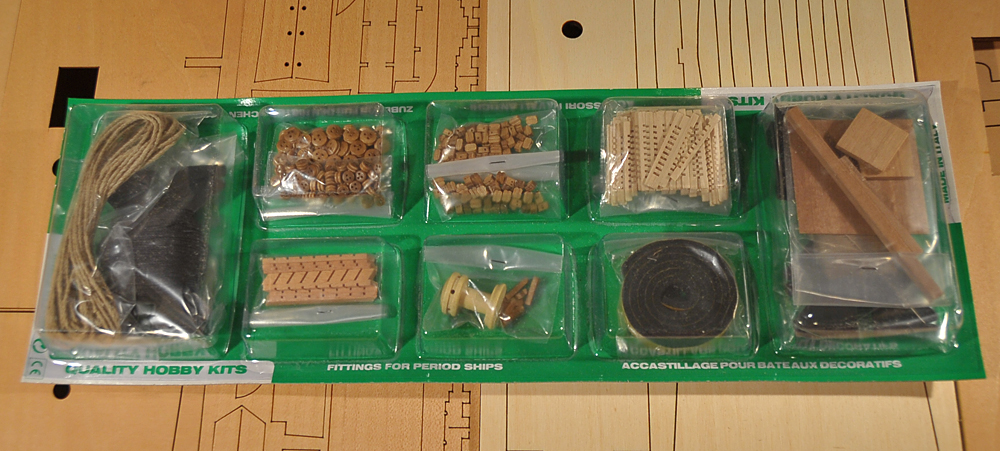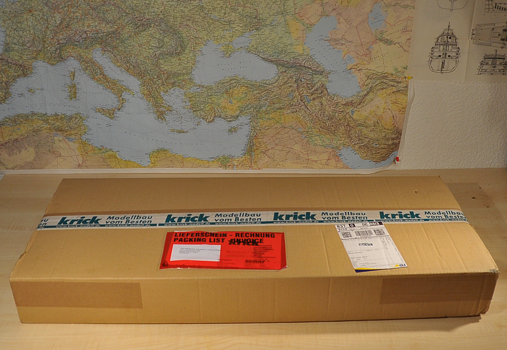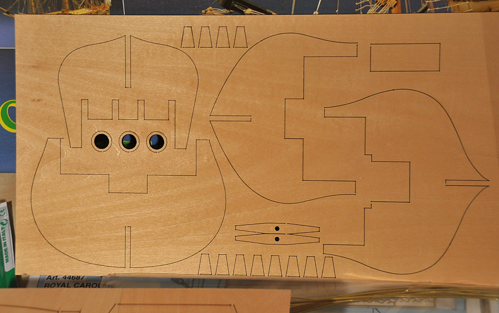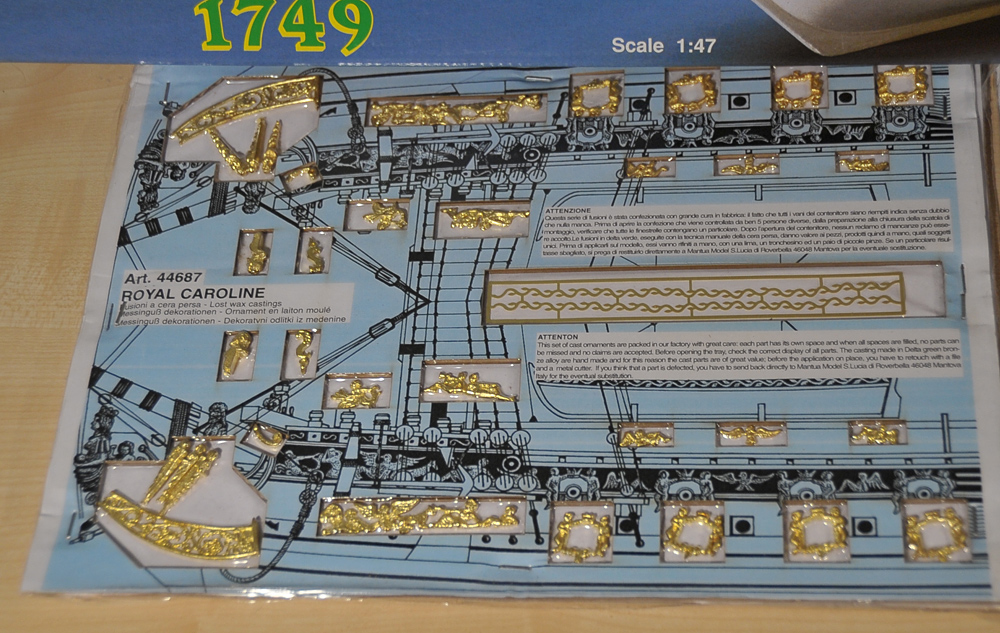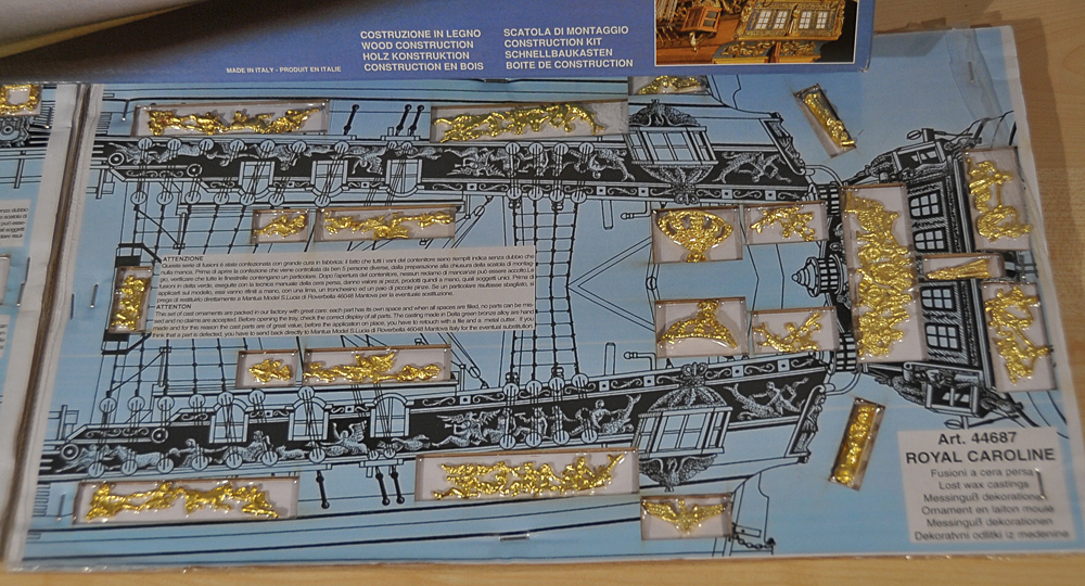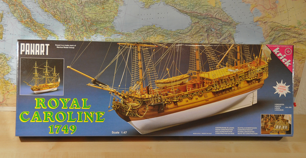 Der Bausatz der Royal Caroline von Panart, einer Tochter von Mantua Model, kann beim Auspacken und nach den ersten Wochen des Baus überzeugen. Das Holz ist von guter Qualität, die zahlreichen Verzierungen sind aus Messingguss. Alleine die Pläne, zumindest der Takel-Plan, könnten besser gestaltet sein.