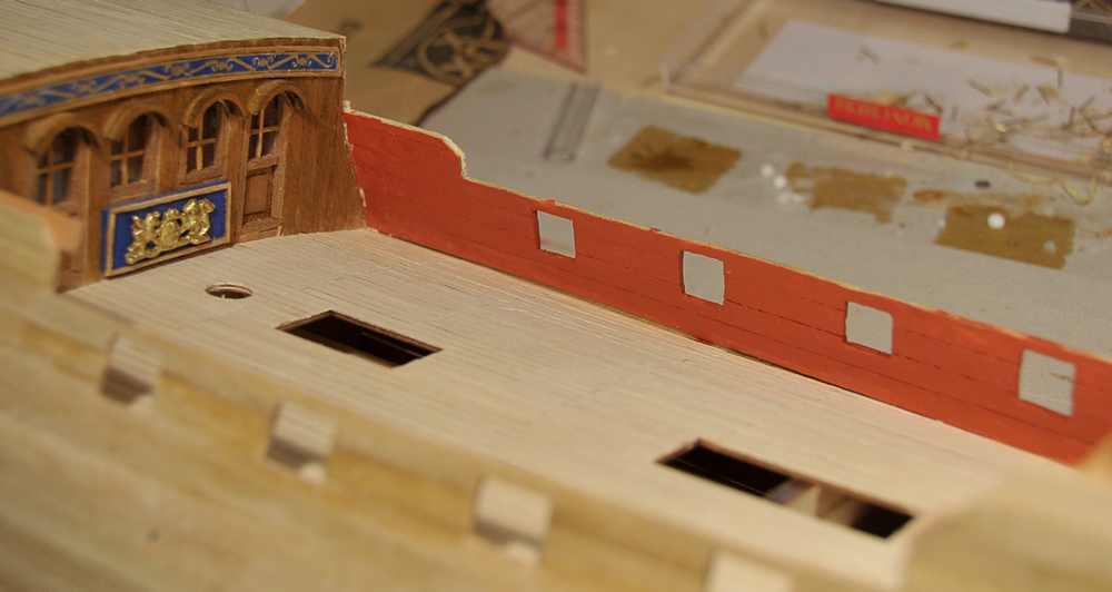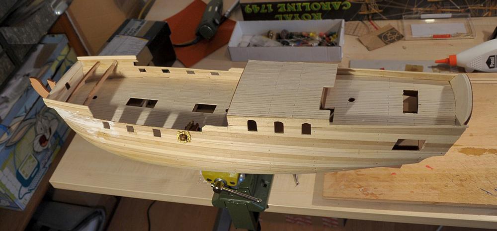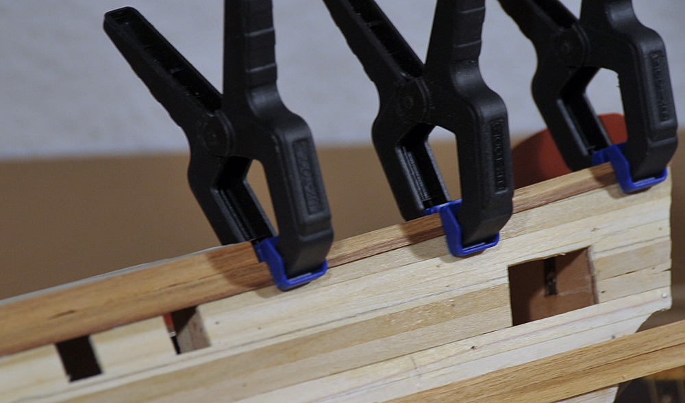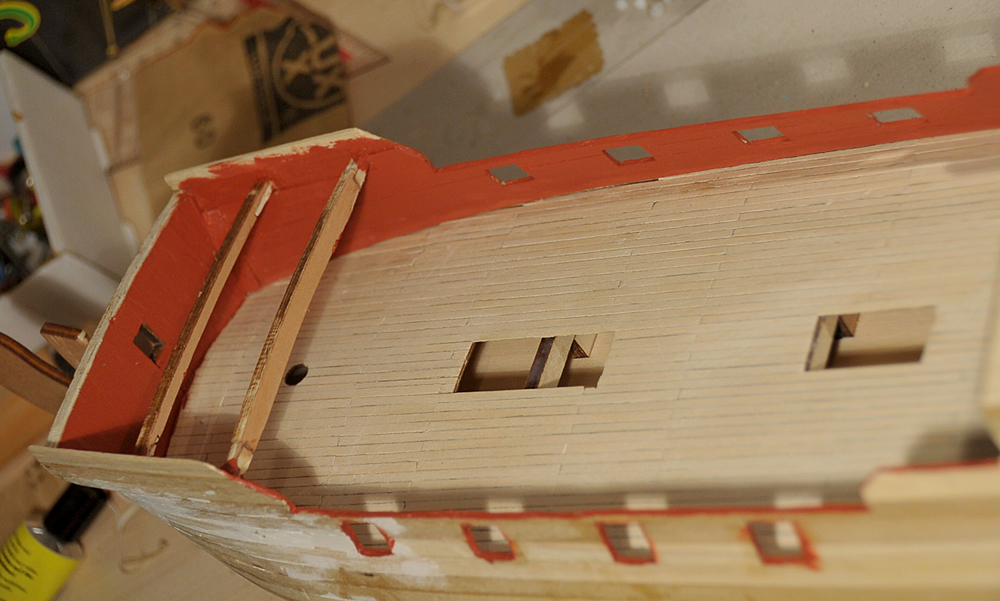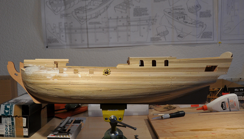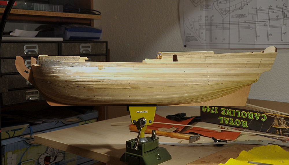 Der Bau geht zufriedenstellend voran, die erste Beplankung musste nur geschliffen werden, es gab kaum etwas zu verspachteln. Vor der Zweitbeplankung habe ich die Innenseiten verkleidet und, wo nötig bemalt. Außerdem hab ich die Ringe und Augbolzen für die Geschütze angebracht. Mittlerweile bin ich bei der zweiten Plankenschicht angelangt. Alles weitere auf den Bildern...