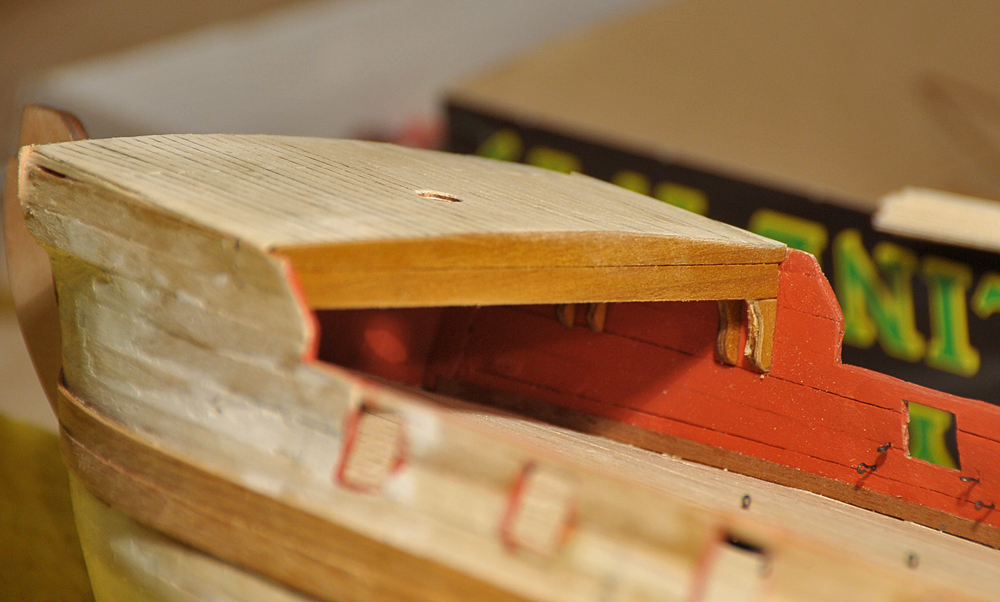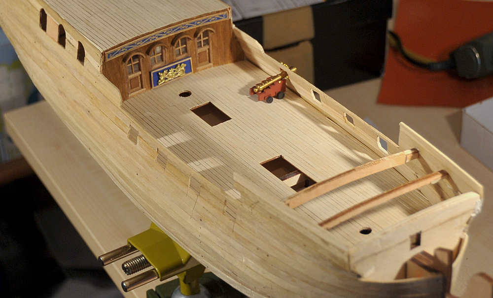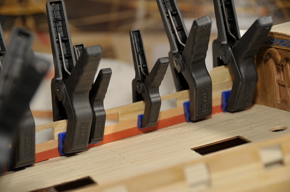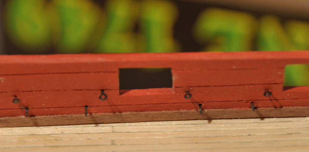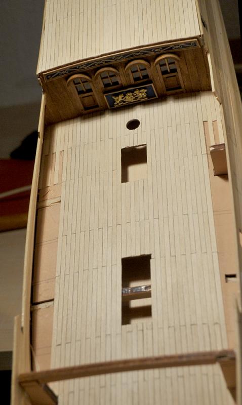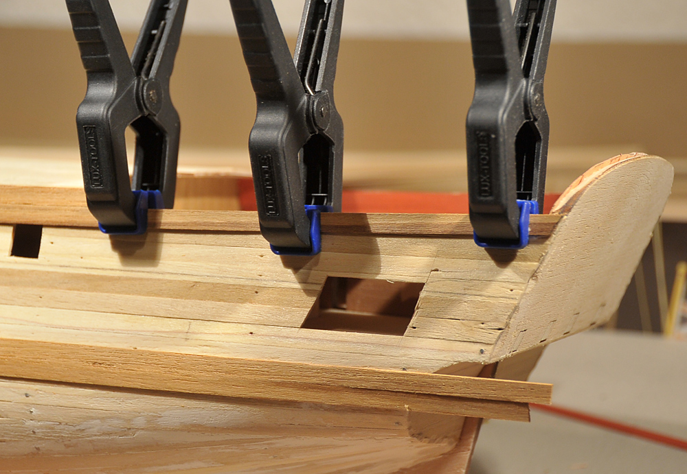 Der Bau geht zufriedenstellend voran, die erste Beplankung musste nur geschliffen werden, es gab kaum etwas zu verspachteln. Vor der Zweitbeplankung habe ich die Innenseiten verkleidet und, wo nötig bemalt. Außerdem hab ich die Ringe und Augbolzen für die Geschütze angebracht. Mittlerweile bin ich bei der zweiten Plankenschicht angelangt. Alles weitere auf den Bildern...