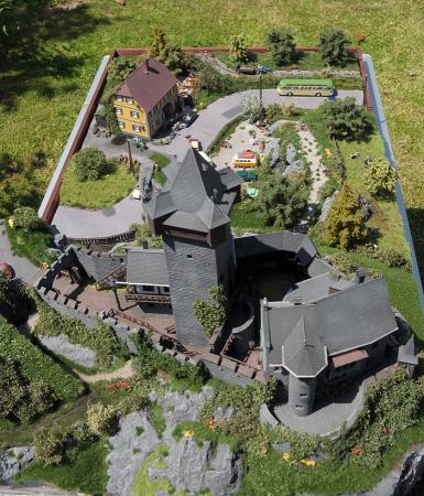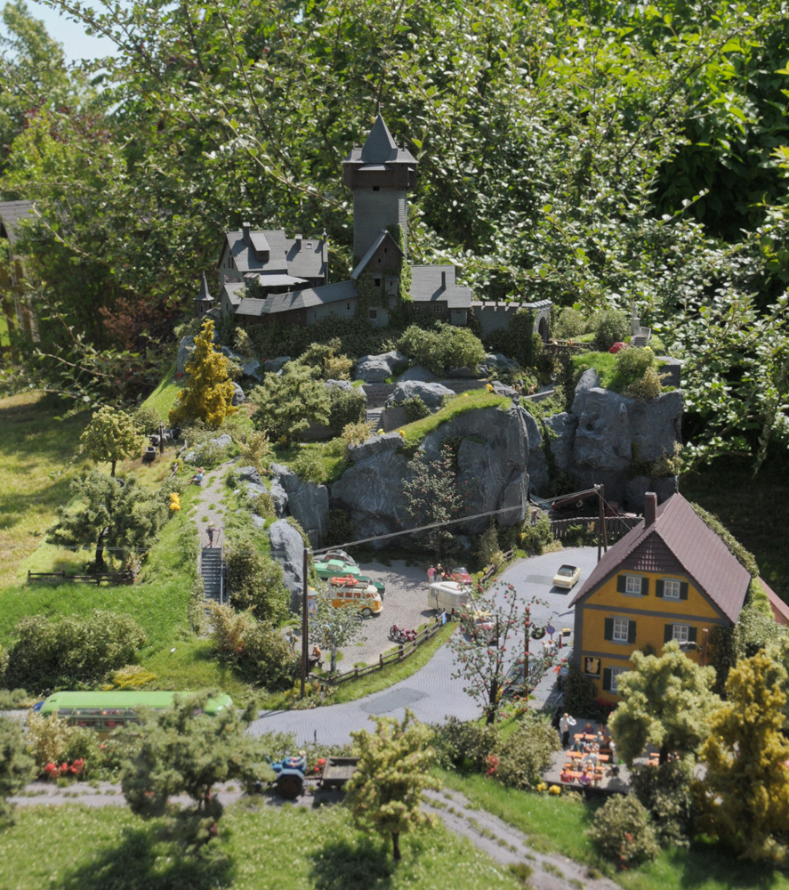 Ziel war es, eine ländliche Szene mit Landstraße und Gasthaus an einer Burg zu bauen. Es sollte eine Ausflugsgaststätte mit Biergarten werden, daneben ein Parkplatz mit Aufgang zur Burg. Angesiedelt ist die Szene so Anfang der 1960er-Jahre. Der Bau beschäftigte mich mit mehreren Unterbrechungen von Dezember 2007 bis Juni 2008.