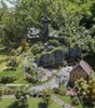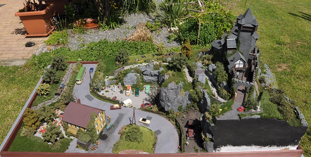 Die Modelle stammen wie gesagt von Kibri, das Landgasthaus ist ein Resin-Bausatz von Langmesser, ebenso der angebaute Schuppen. Felsen hab ich aus der Natur und aus Silikonformen von Noch, die Büsche sowie das meiste Grünzeug kommt von Mini-Natur und Silhouette, die Autos von Brekina, Wiking, Busch. Die Preiserlein beleben die Szenerie ebenso wie die Fahrzeuge, die ich, soweit sie fahrend dargestellt sind, mit Insassen versehen habe. Leider habe ich zu der Zeit noch nicht gewusst, dass es Kfz-Kennzeichen als Decals gibt. Deswegen fahren meine Autos noch ohne. Die Biergartenausstattung kommt von Faller, die Bäume von Faller und Noch. So, das war's... Die Bilder sprechen für sich, hoffe ich.