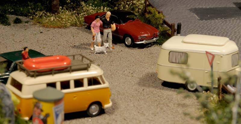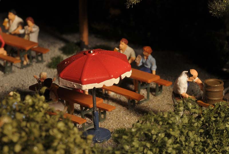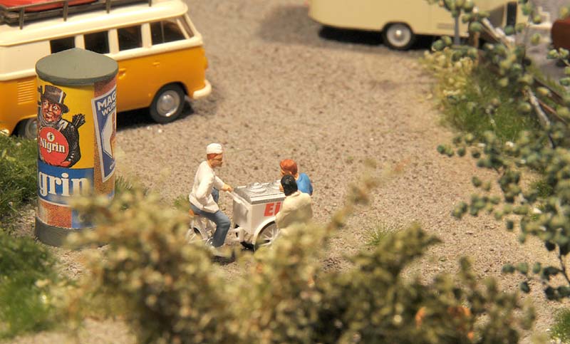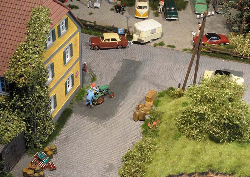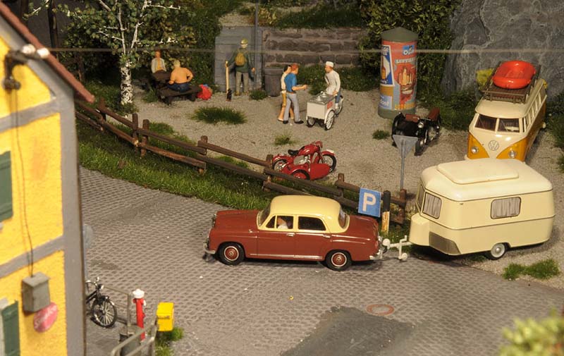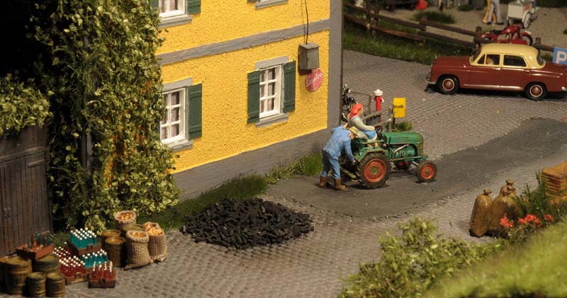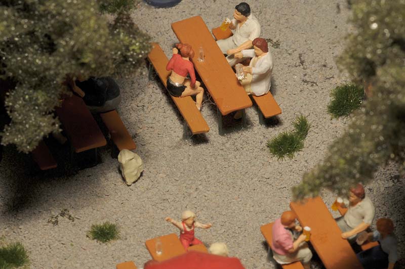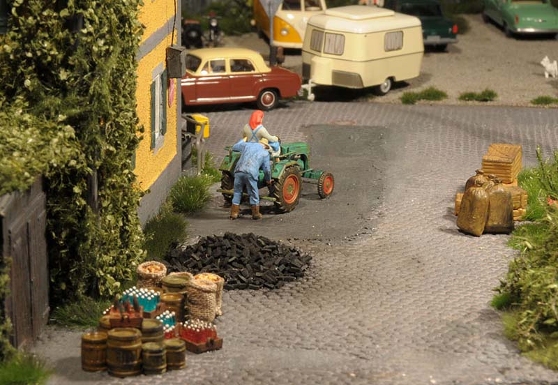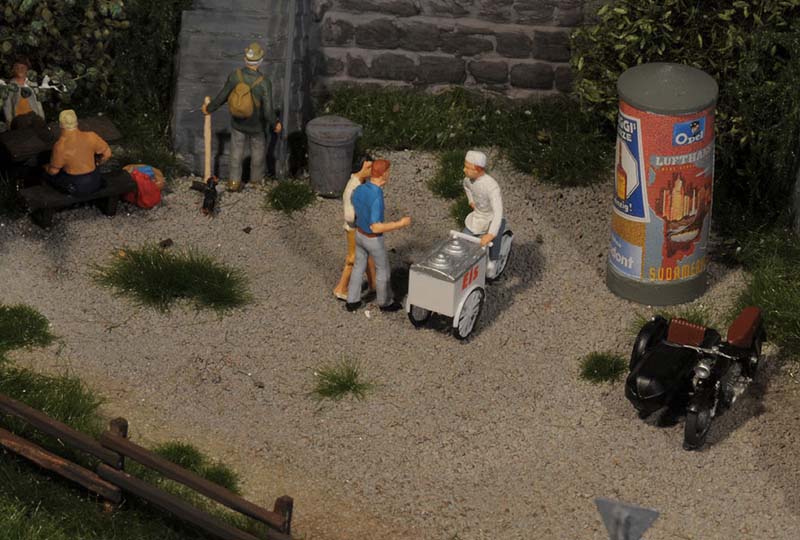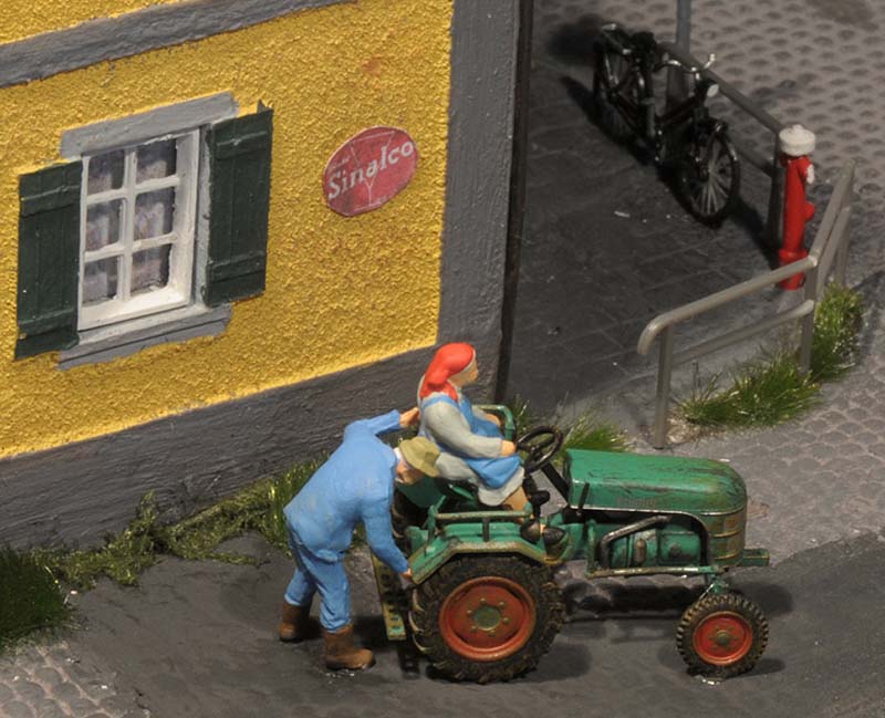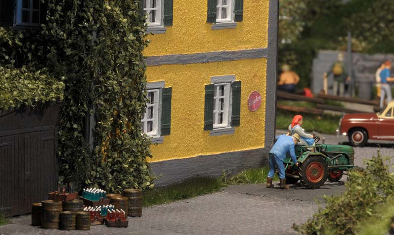 Dazu kommt, dass es mir bei allen Dioramen wichtig ist, die Szenerie mit Interaktionen der Figuren, die das Modell beleben, noch realer zu gestalten. Da sitzen die Preiserleins beisammen, trinken und reden miteinander, gehen gemeinsam wandern. Der etwas angeschickerte Bauer versucht, auf den Traktor zu klettern, an dessen Steuer seine Frau sitzt und bereit zur Abfahrt ist. Ein Paar schlendert zusammen mit dem Terrier vom Parkplatz zum Gasthaus, ein anderes verläßt mit dem Wohnwagengespann gerade den Parkplatz, nachdem es sich im Gasthaus gestärkt hat. Im Biergarten wird gescherzt, gespielt, gegessen, auf der Bank gegenüber der Viehweide rastet ein kleine Gruppe. Der Eisverkäufer macht ein gutes Geschäft.