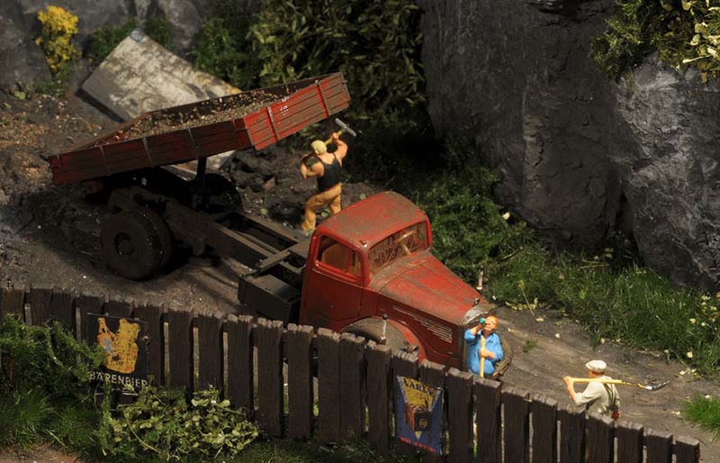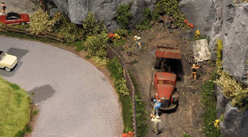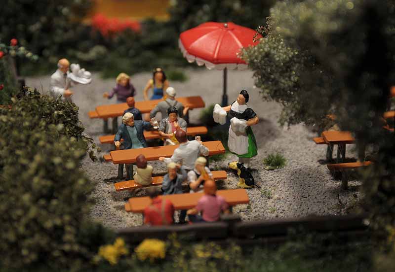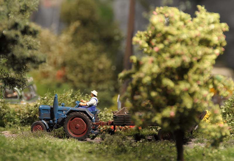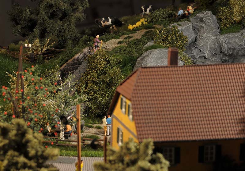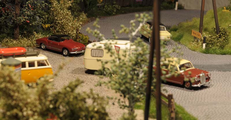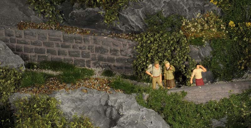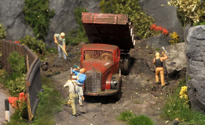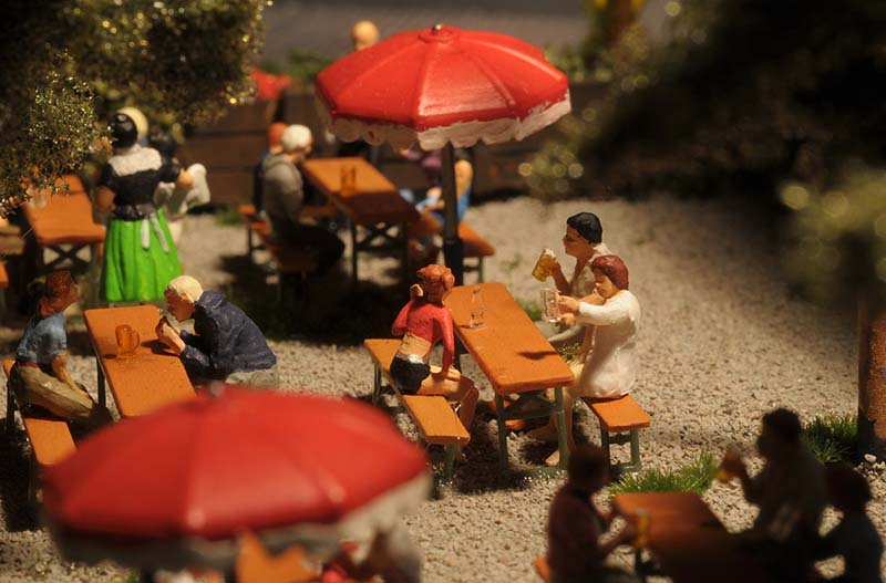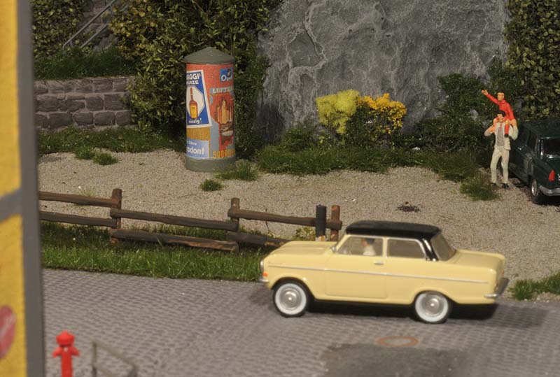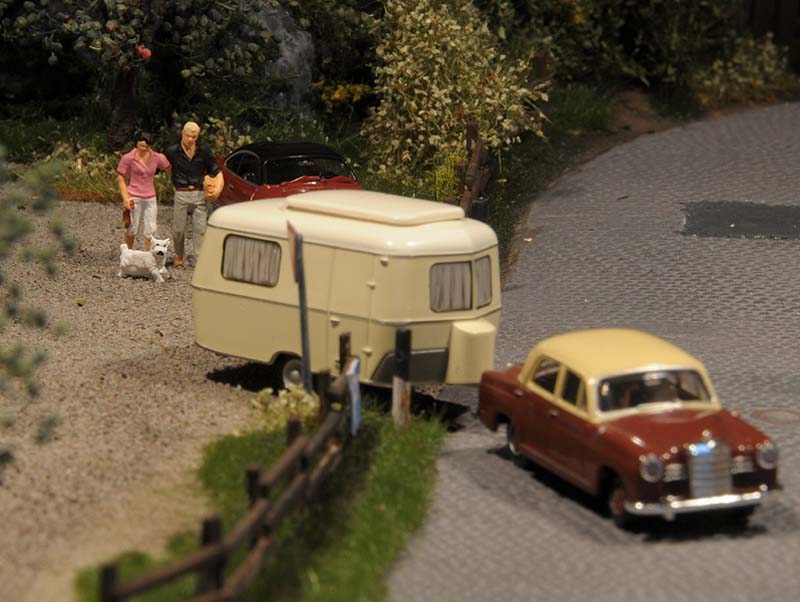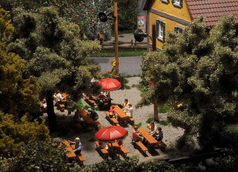 Dazu kommt, dass es mir bei allen Dioramen wichtig ist, die Szenerie mit Interaktionen der Figuren, die das Modell beleben, noch realer zu gestalten. Da sitzen die Preiserleins beisammen, trinken und reden miteinander, gehen gemeinsam wandern. Der etwas angeschickerte Bauer versucht, auf den Traktor zu klettern, an dessen Steuer seine Frau sitzt und bereit zur Abfahrt ist. Ein Paar schlendert zusammen mit dem Terrier vom Parkplatz zum Gasthaus, ein anderes verläßt mit dem Wohnwagengespann gerade den Parkplatz, nachdem es sich im Gasthaus gestärkt hat. Im Biergarten wird gescherzt, gespielt, gegessen, auf der Bank gegenüber der Viehweide rastet ein kleine Gruppe. Der Eisverkäufer macht ein gutes Geschäft.