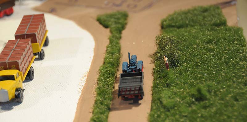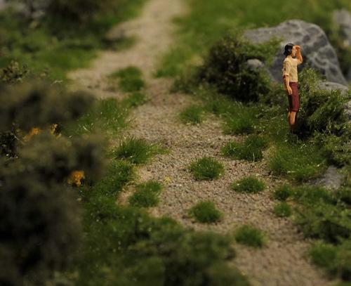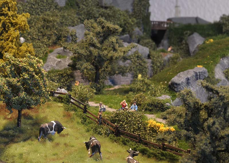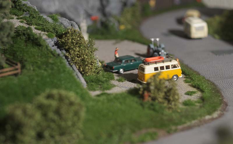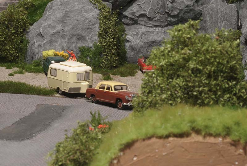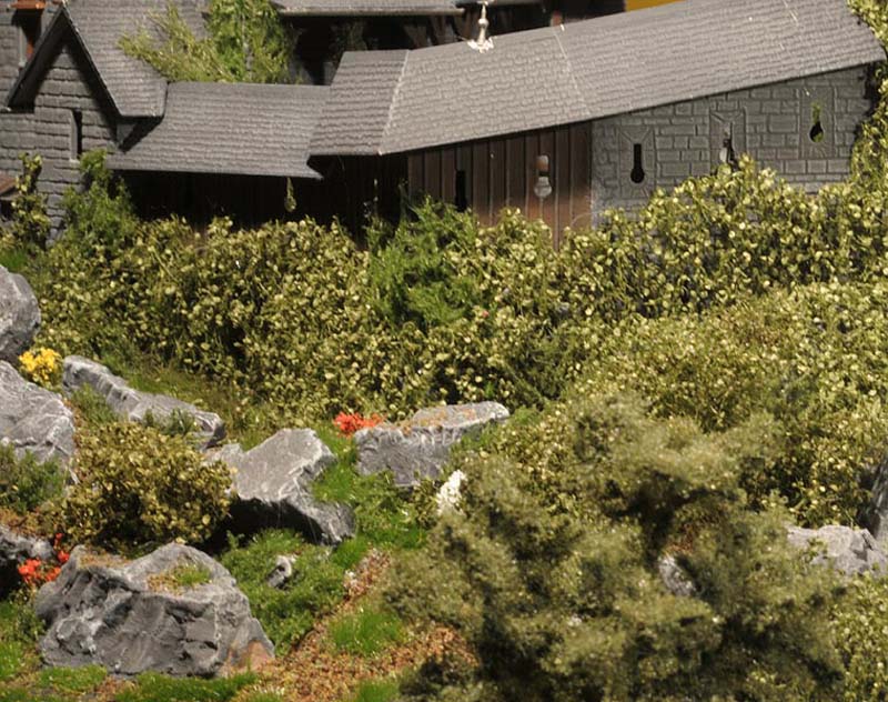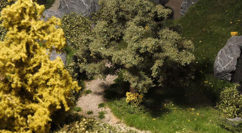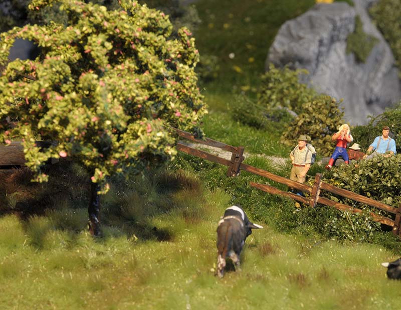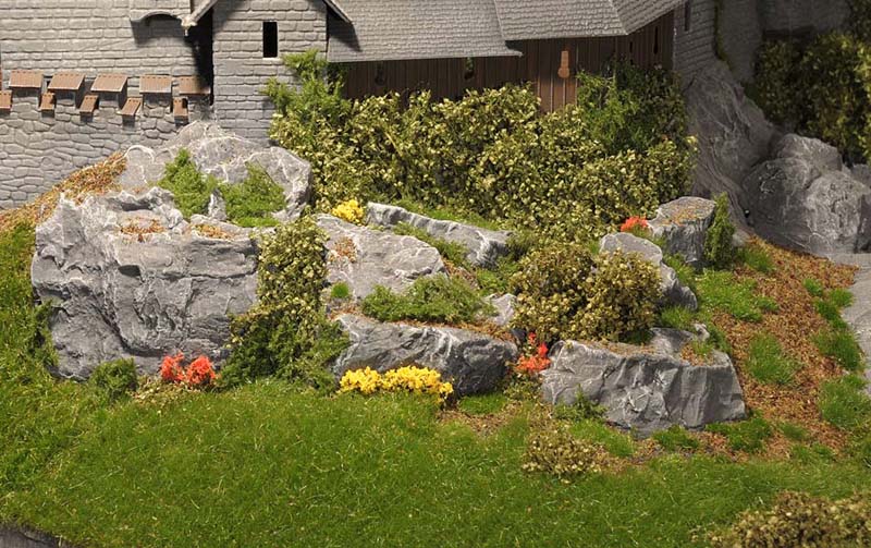 Was wäre eine schöne sommerliche Landschaft mit Burg und Straße und Gasthaus ohne viel Grün drumherum? Leer und kahl und öde... Doch das ist ja nicht des Modellbauers Ziel und darum hab ich überall kräftig Wiesen, Sträucher, Blumen und Bäume wachsen lassen. Das Material kommt durch die Bank von Mini-Natur (sehr gut, aber nicht billig), die Bäume stammen von Faller.