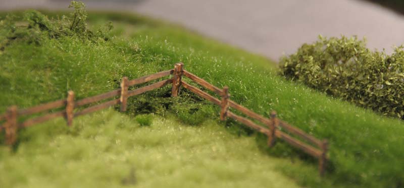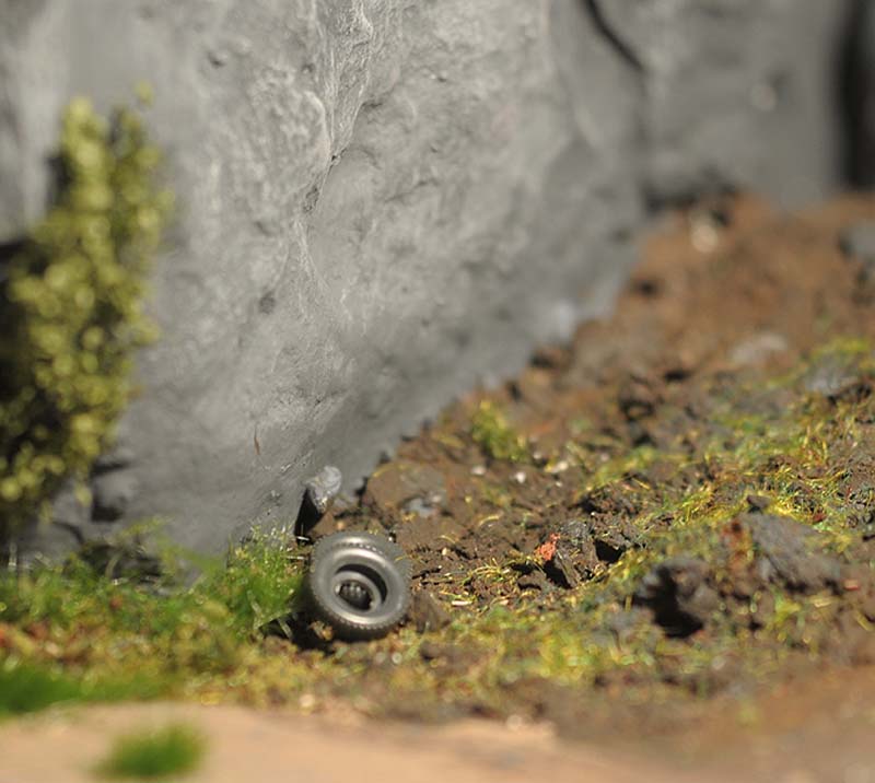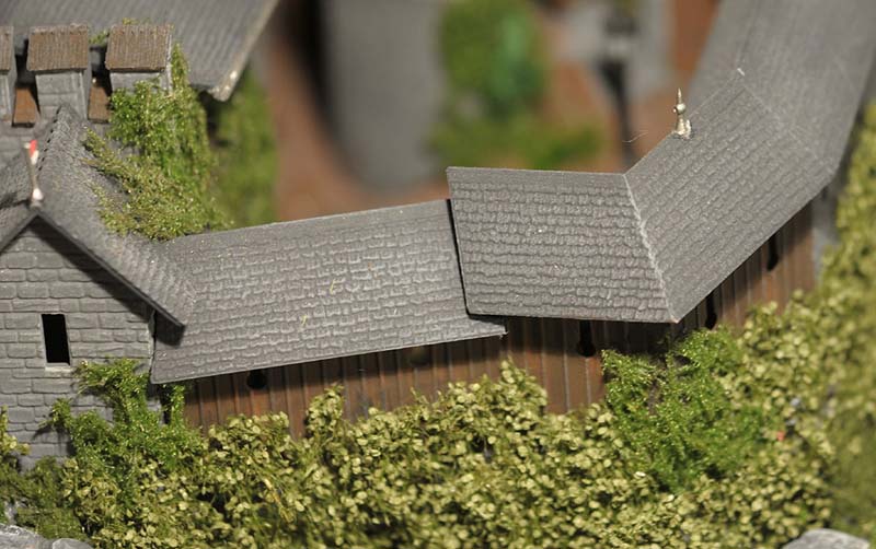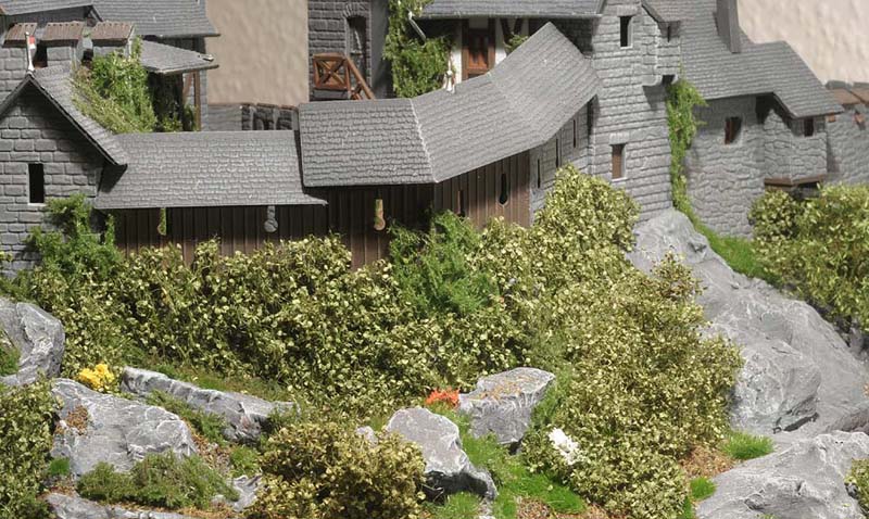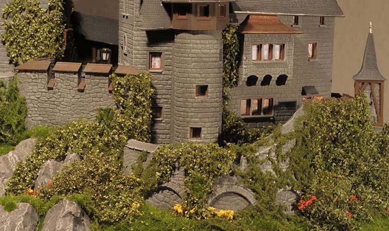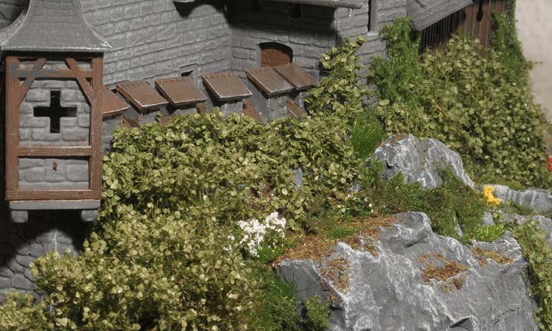 Ich wollte auch unbedingt die Burganlage in das Grün einbauen. Also verdichtete ich die Bepflanzung rund um die Umfassungsmauer und ließ Rankgewächse hochkriechen. Auch eine Wiese und eine Viehweide konnte ich in das Diorama integrieren, außerdem jede Menge Grün, das durch Riten spitzt oder entlang der Wege in Büscheln wächst. Es war eine der schönsten Arbeiten an der Burg Bärenklamm. Die Bilder in der untenstehenden Bildergalerie sind weitgehend ohne Text, denn es gibt kaum etwas zu erläutern. Dafür umso mehr zu sehen.