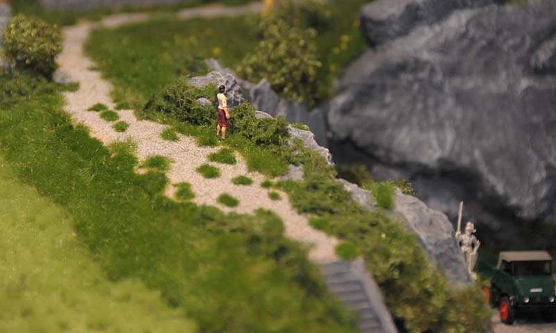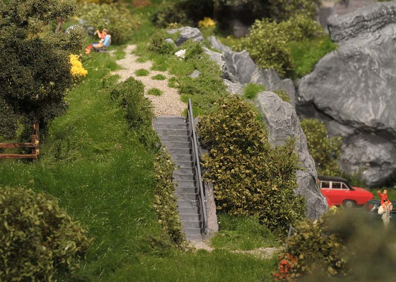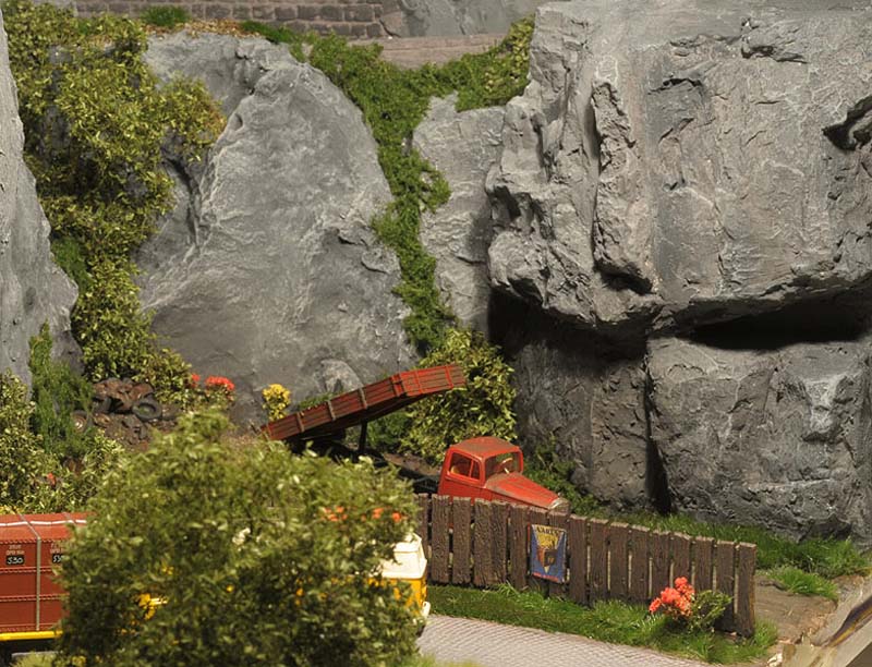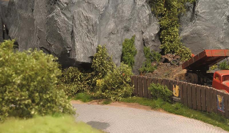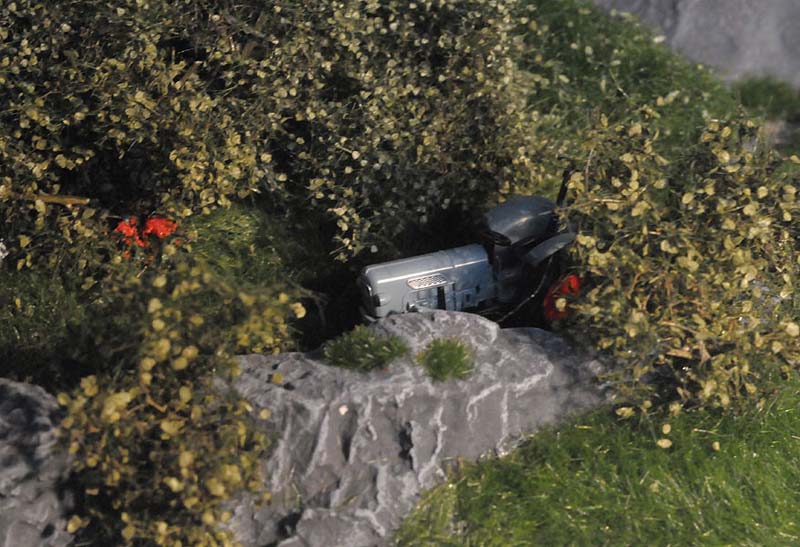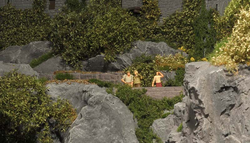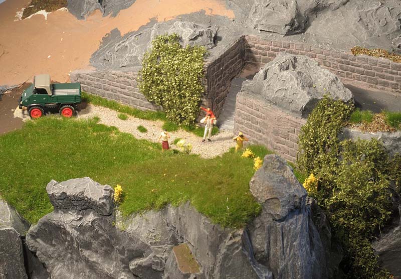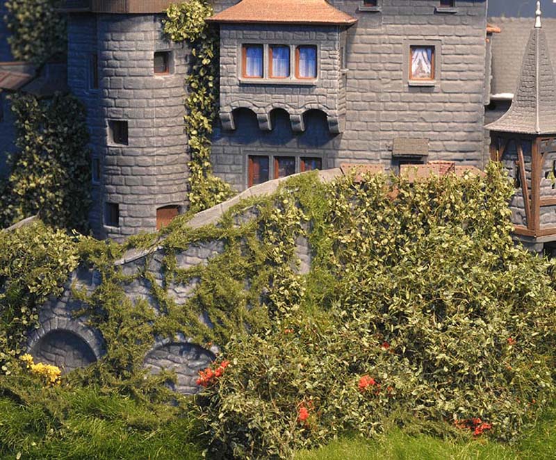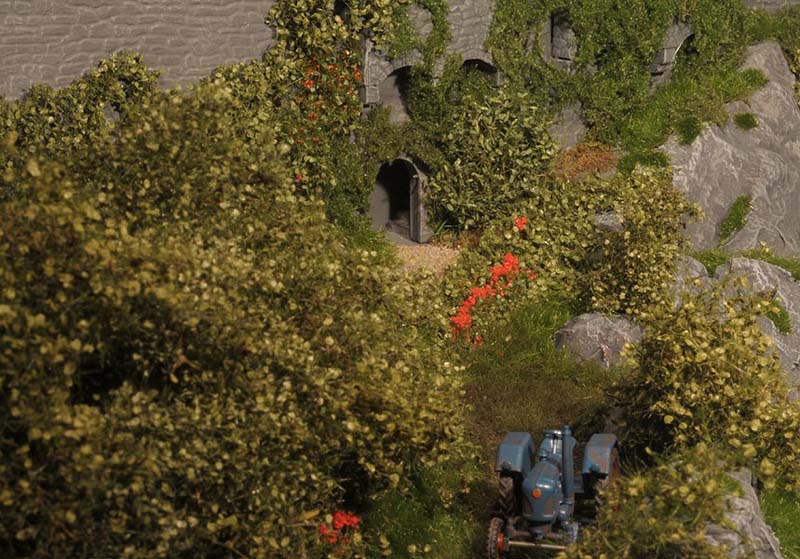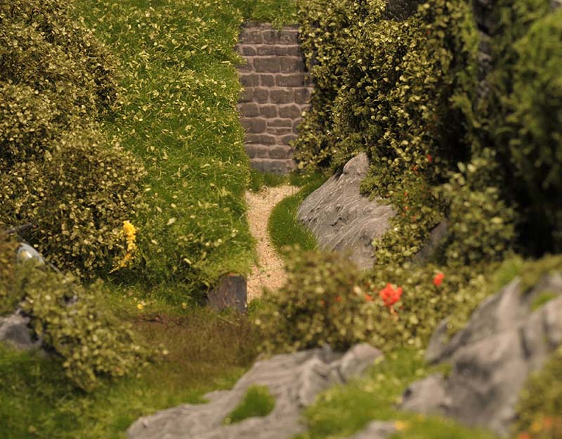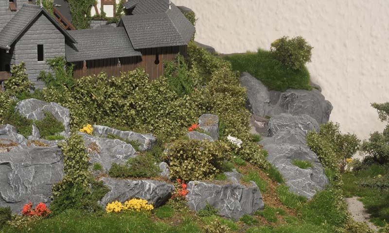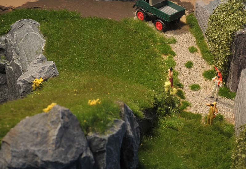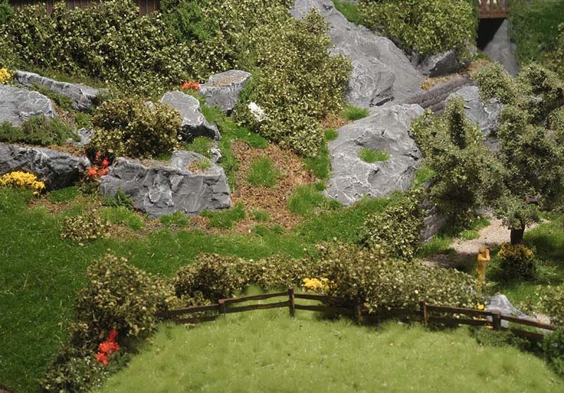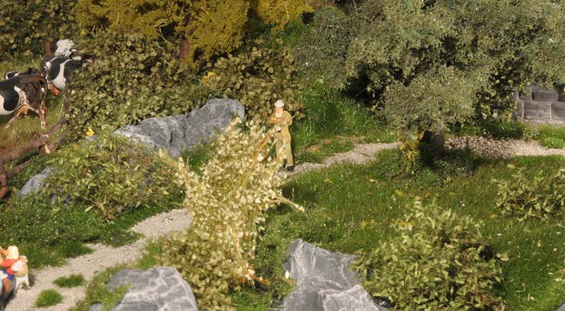 Am liebsten habe ich die Wiesenmatten verarbeitet. Sie lassen sich wunderbar dehnen und strecken. Auf die Gipsunterlage, dunkel eingefärbt, damit es nicht weiß durchschimmert, ordentlich UHU drauf, kurz anziehen lassen und dann die Matte draufpressen. Ebenso die Efeuranken und das Laub auf UHU und das wird ganz toll. Sehr schön wirken auch die Blumen und Sträucher in verschiedenen Farben. Die bunten Tupfer im Grün beleben die Szene merklich.